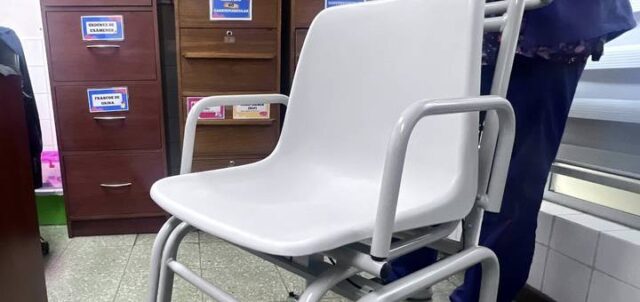Por esto, el Departamento de Salud adquirió una balanza silla con una capacidad de 200 kg, apoyabrazos y apoyapies abatibles, freno que asegura la posición de las ruedas, asiento ergonómico, y ruedas de marcha suave que, junto con el asidero ergonómico, facilitan notablemente las maniobras al momento de pesar. El equipo ofrece la función TARA, con la que se puede pesar separadamente cada nuevo peso agregado, y la función auto-HOLD, que permite que el personal atienda al paciente antes de leer el resultado del pesaje.