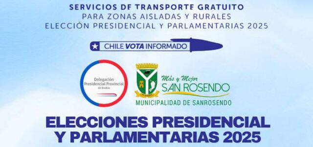San Rosendo, noviembre de 2025; Desde la Delegación Presidencial Provincial de Biobío y la Municipalidad de San Rosendo se informa recorridos de transporte gratuito hacia y desde la comuna, en el marco del proceso Elecciones Presidencial y Parlamentarias 2025.