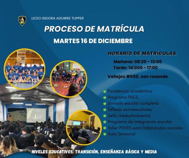 San Rosendo, diciembre de 2025; Desde el Liceo Isidora Aguirre Tupper (LIAT) San Rosendo informan a la comunidad sobre proceso de matrícula 2026.