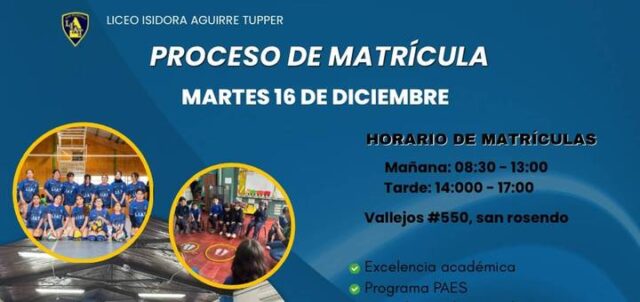 «Queridas familias y comunidad educativa: Les informamos que el martes 16 de diciembre se realizará el proceso de matrícula para el año 2026. Los invitamos a asistir en los horarios establecidos, con el fin de completar su matrícula de manera ordenada y oportuna.