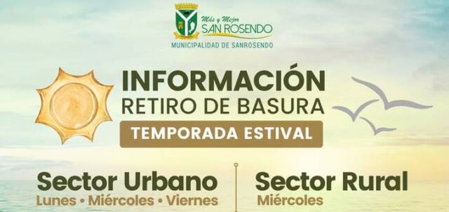 San Rosendo, enero de 2026; Municipalidad de San Rosendo informa a la comunidad que el servicio de recolección de residuos domiciliarios para la temporada estival 2026 (enero y febrero) se realizará en los días que se indica y en los horarios habituales.