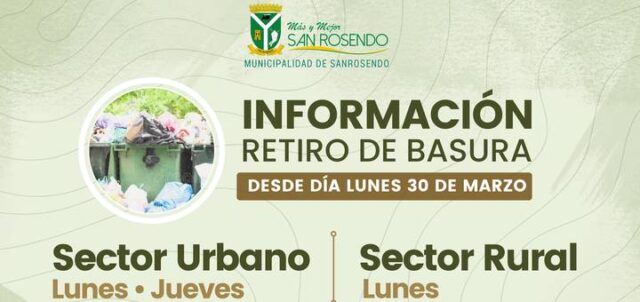San Rosendo, marzo de 2026; Municipalidad de San Rosendo informa a la comunidad que el servicio de recolección de residuos domiciliarios realizará cambios en los días que se indica, manteniendo los horarios habituales. Para el sector urbano y rural;