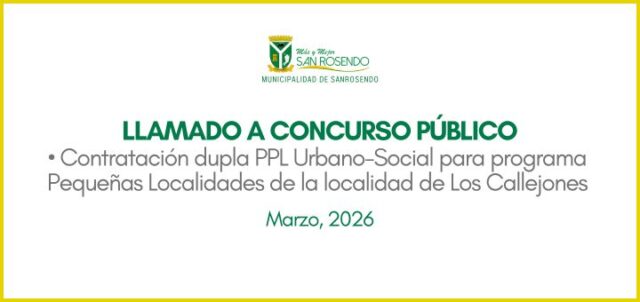 San Rosendo, marzo de 2026; La Municipalidad de San Rosendo, llama a concurso público para contratar una dupla PPL Urbano-Social, para el Programa Pequeñas Localidades de la Localidad de Los Callejones, para estos profesionales contempla una contratación a Honorarios con una remuneración de $1.600.000 brutos, plazo fijo, cuyo proceso de recepción de antecedentes finaliza el 20 de marzo de 2026 a las 12:00 horas.