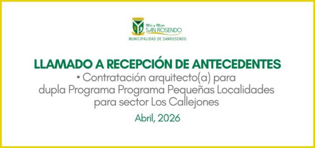 San Rosendo, abril de 2026; La Ilustre Municipalidad de San Rosendo, en convenio con la Seremi de Vivienda y Urbanismo, por intermedio de su Dirección de SECPLAN, quien actúa como contraparte del Programa de Pequeñas Localidades en el Sector Rural Los Callejones, llaman a recepción de antecedentes para completar nómina de profesional arquitecto para funciones profesionales como parte de la dupla Social y Urbana, del siguiente cargo: